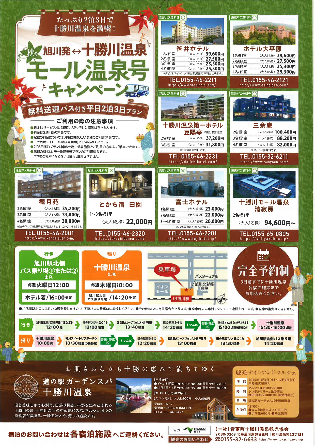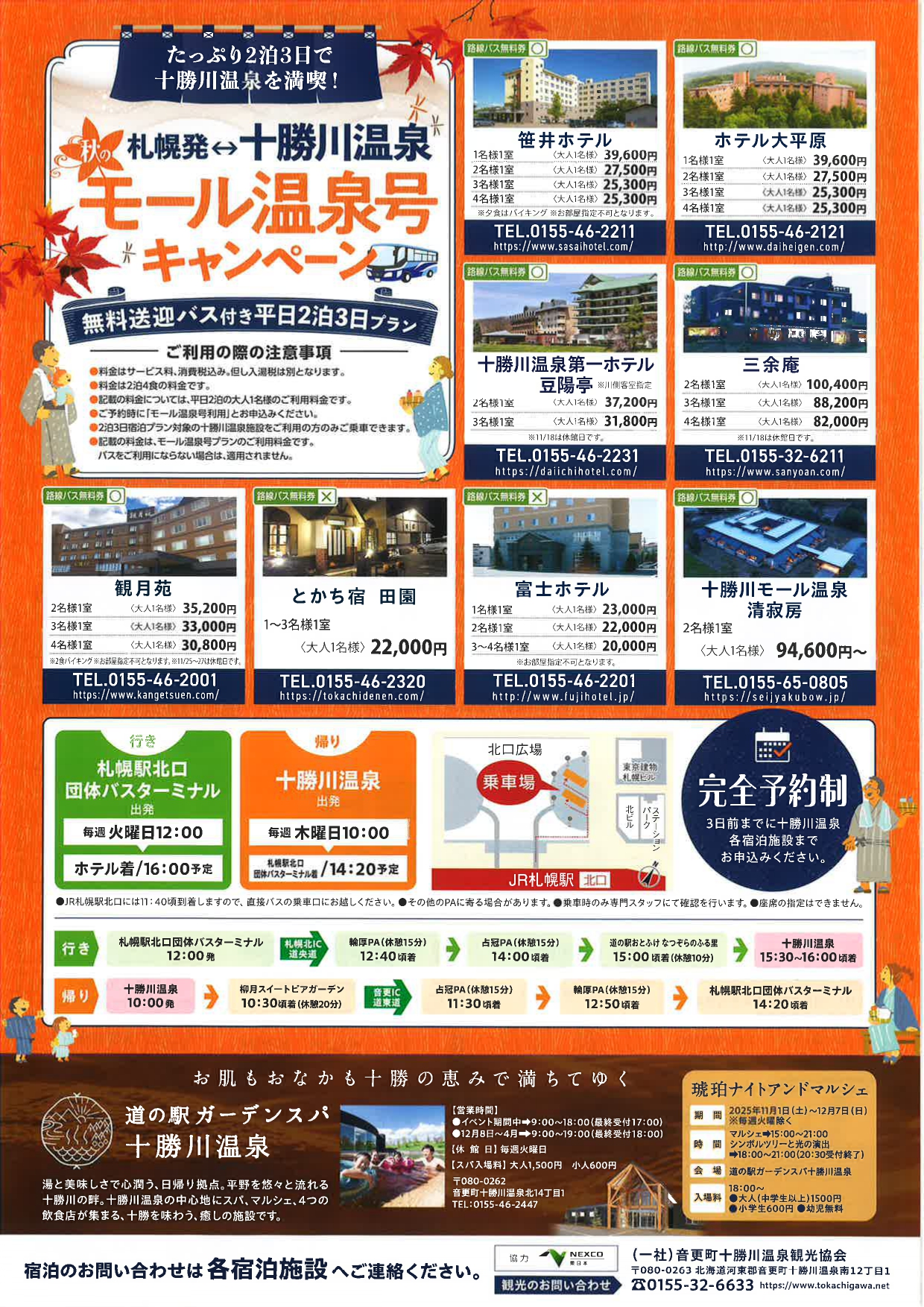 ・完全予約制(3日前までに十勝川温泉各宿泊施設までお申し込みください。)