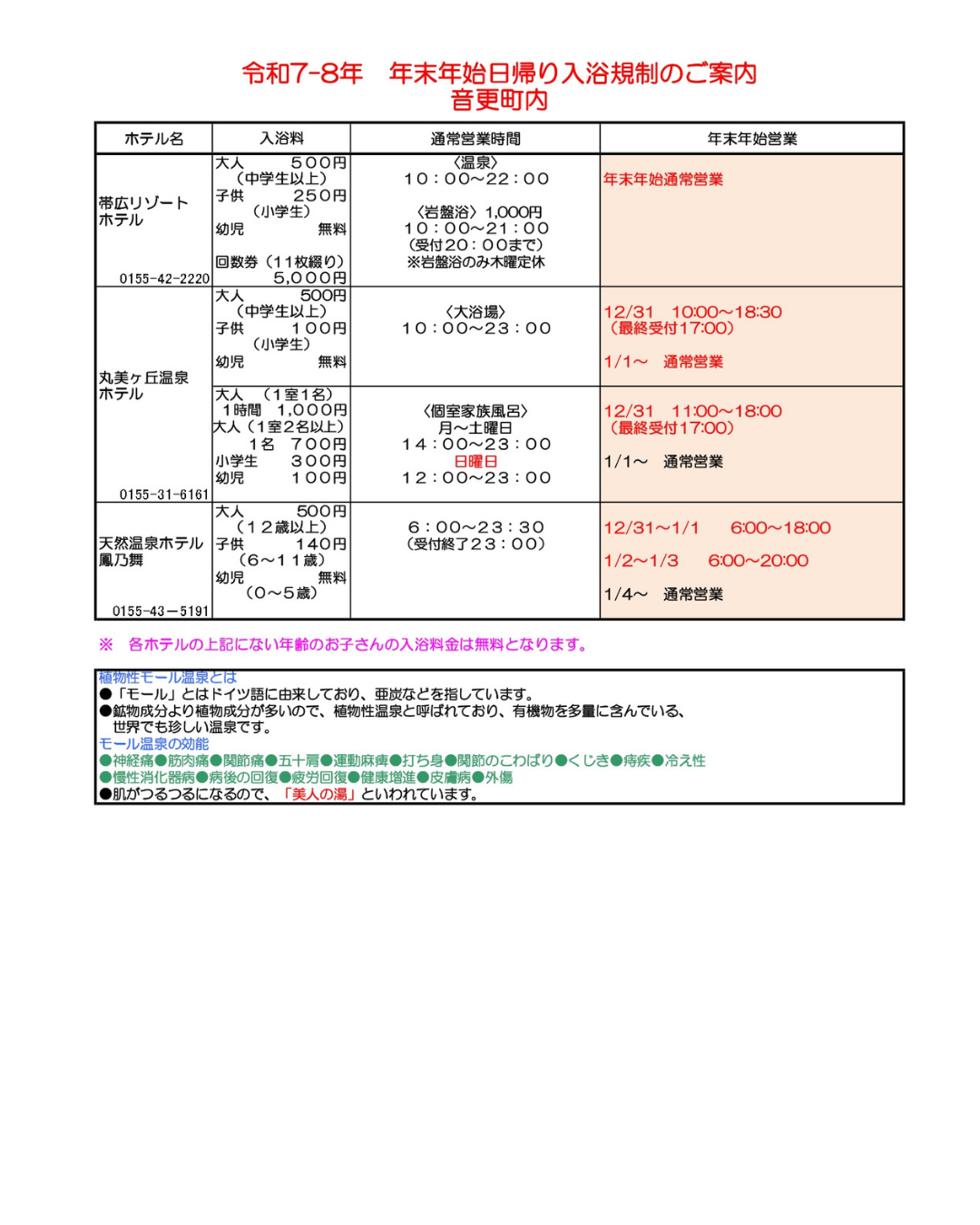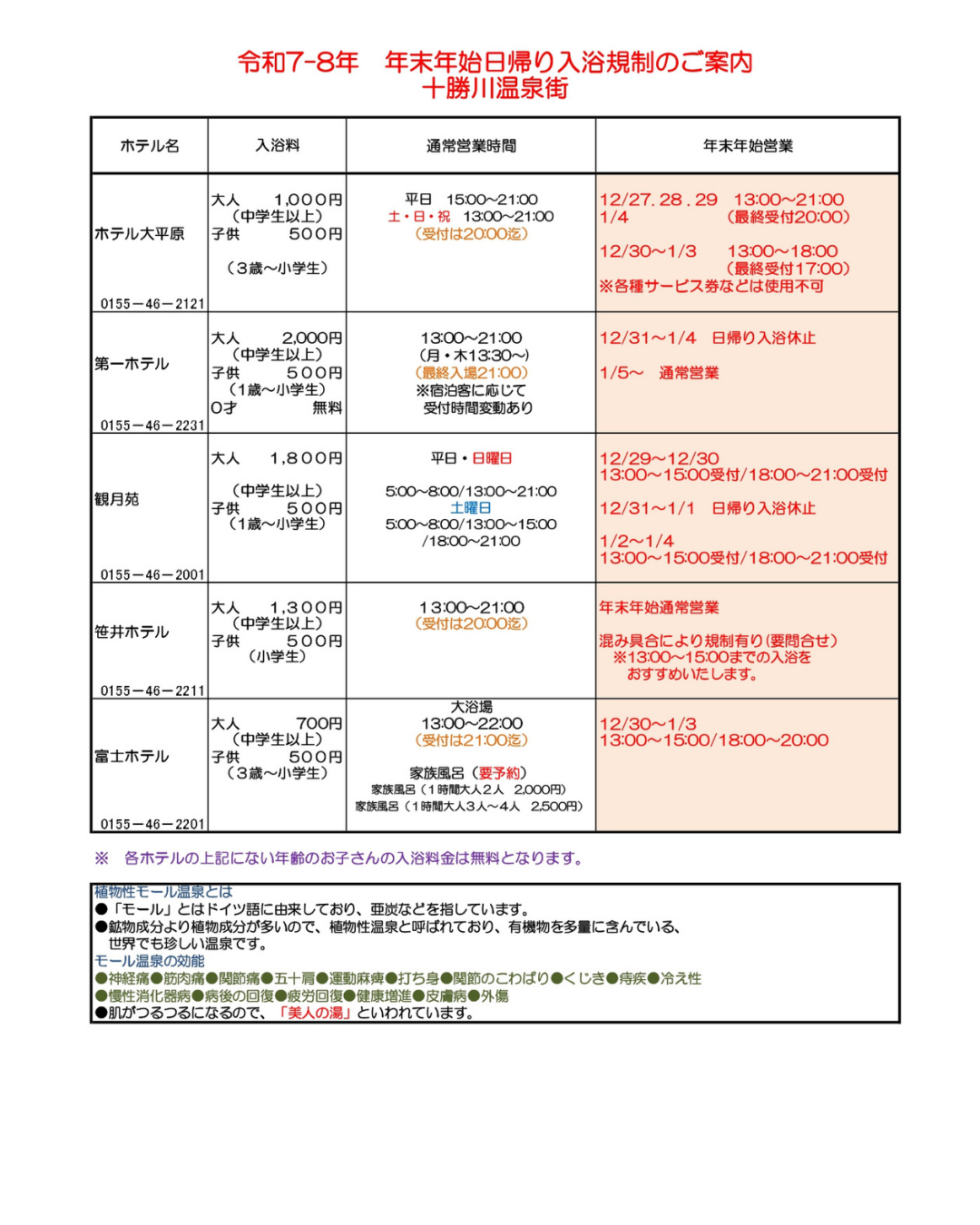 2025/12/26温泉・宿 【お知らせ】年末年始の日帰り入浴について 12/27~1/4の日帰り入浴について 温泉街のホテルについては、宿泊客のチェックイン状況により時間の変更や、利用をお断りする場合がございます。 各ホテルに事前にお電話で確認することをお勧めいたします。