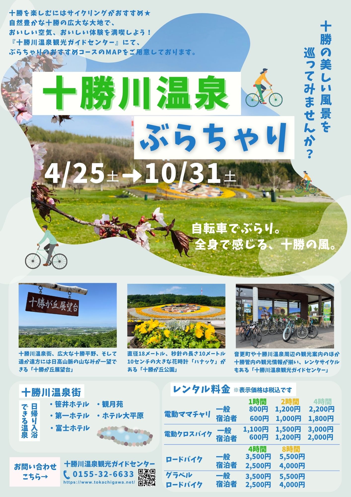 2026/04/15観光 【令和8年度】レンタサイクルぶらちゃり ご案内 \令和8年4月25日~令和8年10月31日開催✨/ 【レンタサイクルのご案内】 十勝を楽しむにはサイクリングがおすすめです✨ 自然豊かな十勝の広大な土地で、おいしい空気を体験しましょう! 十勝川温泉観光ガイドセンターにて、ぶらちゃりのおすすめコースのマップをご用意しておりますので、ご利用をお待ちしております。